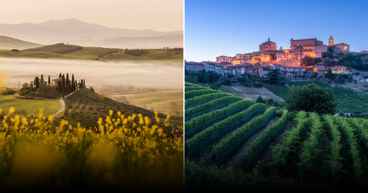 No coração do Piemonte, as colinas verdes são repletas de vinhedos renomados de Barolo e de campos de trufas brancas. A região é conhecida por seus mercados de comida, visitas a vinícolas e castelos históricos. O melhor período para visitação é outubro, ao tempo do Festival das Trufas Brancas em Alba, que celebra essa iguaria local.